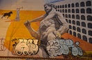 via dei Pisoni si trova l’opera più famosa di Ron English intitolata “Baby Hulk“: è rappresentato un bambino con la pelle color verde smeraldo e dai bicipiti perfetti accanto ad un topolino con la maschera anti-gas. Entrambi, sono inquietanti simboli di un mondo mutante e isolazionista dove non si vive più l’ingenuità dell’infanzia poichè si è costretti a combattere quotidianamente per la sopravvivenza.