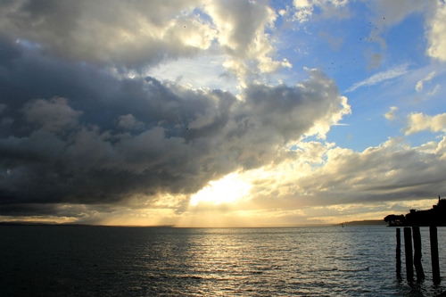 Nuvole cariche di pioggia e sprazzi di sereno sulle acque del lago Trasimeno.