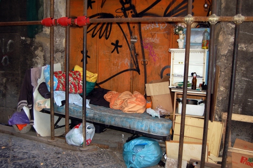 Altri tag (senza riscontro): borse, disordine, rete, tubi, sacchi, miseria, scatole, barbone, graffiti, sbarre, giacìglio, strada, arancione, pali, senzatetto, povertà, rovina, cuscino, coperte, letto, mobili, sporco.