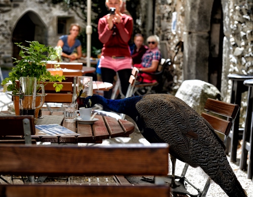 Ristorante a Trento. Il cliente seduto al tavolo aspettava il caffè impaziente si è alzato per andare in bagno, nel frattempo il caffè è arrivato ed il pavone pian piano né ha approfittato.