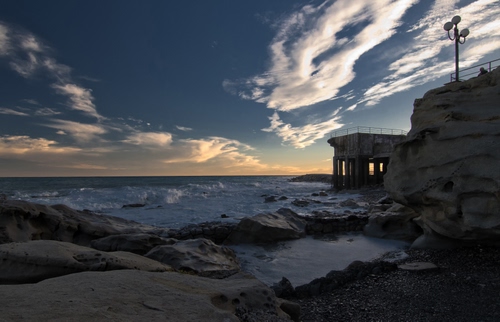 Tag: mare, nuvole, cielo, acqua, onde, lampione, scogli, rocce, tramonto.