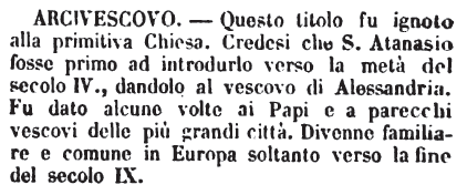 Arcivescovo - Questo titolo fu ignoto alla primitiva Chiesa. Credesi che S.Atanasio fosse primo ad introdurlo verso la metà del secolo IV., dandolo al vescovo di Alessandria. Fu dato alcune volte ai Papi e a parecchi vescovi delle più grandi città. Divenne familiare e comune in Europa soltanto verso la fine del secolo IX. [immagine]
